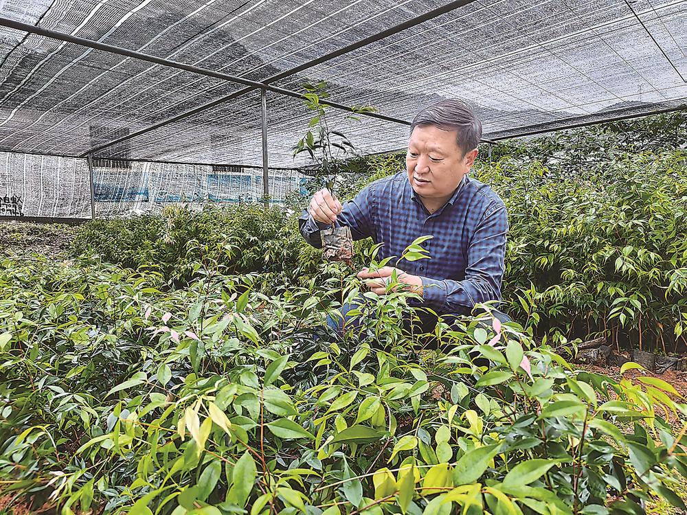 祁小波在福建省林业科技试验中心白果蒲桃扦插苗圃观察苗木生长情况。