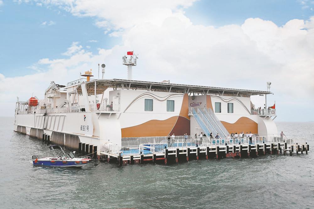 基于宽阔的甲板空间和稳定的主体结构,“闽投1号”搭载海景客房、海上餐厅、多功能会议室、露天水吧等多功能舱室。人们在这里可以体验智慧渔业,也可以休闲垂钓,感受海上风光。以旅促渔、以渔带旅,串珠成链、连线成片,一条陆海联动的渔港亮丽风景线正在打造中。