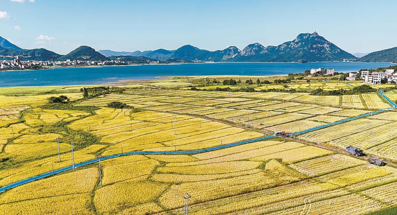 稻田不远处,就是碧波荡漾的东张水库。1958年,东张水库建设时,主要承担农业灌溉。如今,东张水库升级为福清人民主要的饮用水源地,供水范围包括18个镇街。2023年7月起,随着“一闸三线”工程全线通水,东张水库又成为向平潭供水的调节库,水生态的要求更高了。