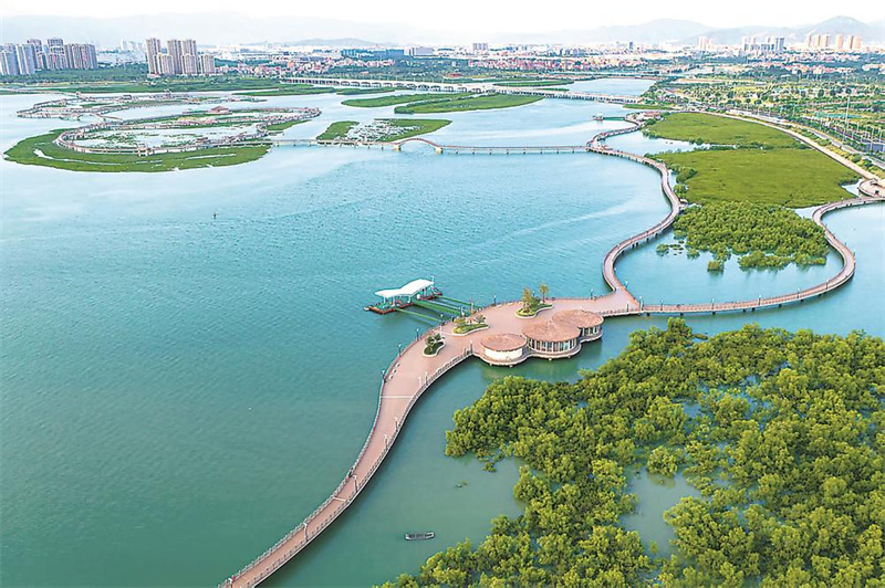 这一技术应用,提高了红树林存活的稳定性,且为众多生物提供更丰富的栖息、觅食和繁殖场所。在高处俯瞰鳌冠湾,但见青枝拂浪,鱼虾穿梭,海鸟掠翅,人与万千生灵,共同见证着红树林的繁茂,也见证着海沧生态环境的持续向好。