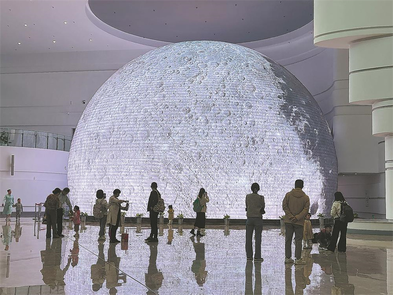 刚步入新馆大厅,记者就被眼前巨大的“球体”吸引,时而出现木星,时而变换月球……“这是用先进材料打造的智能化LED玻璃幕墙,内外双屏结构,可以播放视频、图片、文字等,是省内首座双屏球幕影院。”讲解人员向参观者介绍道。