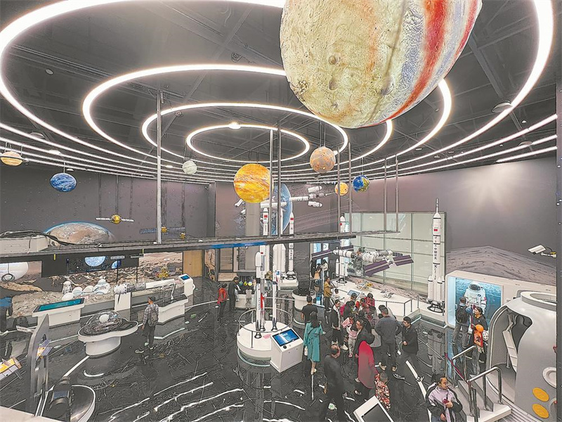 7大主题展厅设计各有特色,例如,航天航空展厅以黑白色为主色调,挑高的空间上方,用灯带模拟出银河系的螺旋星系形状,上面分布着各大“恒星”球体,整体空间营造出宇宙深邃与探索的氛围。