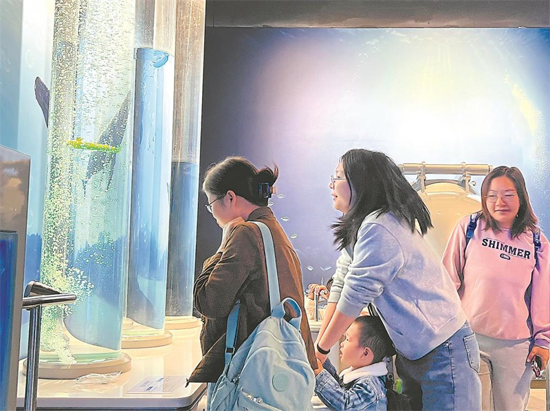 人群中,一双充满稚气的大眼睛吸引了记者的注意。这个四五岁的小男孩或许是第一次看到潜艇的模型,他紧盯着管道内气泡产生,使出吃奶的劲按压了好几下手杆,“潜艇”慢悠悠地上浮了。“太好玩了!”一番操作下来,小男孩还舍不得离开。
