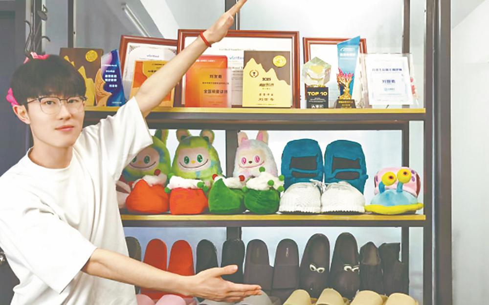 刘世奇展示自己公司设计的各种拖鞋。(资料图片)
