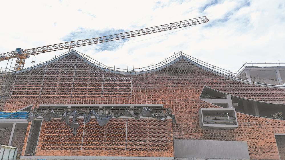 走进金沙书院施工现场,浓浓的闽南建筑风格扑面而来。只见一座四重院落一字排开,绵延200余米。红墙、红瓦、夯土、木拱,大跨度连续性五重曲面屋顶,有如一部朝天铺开的经折装古书。