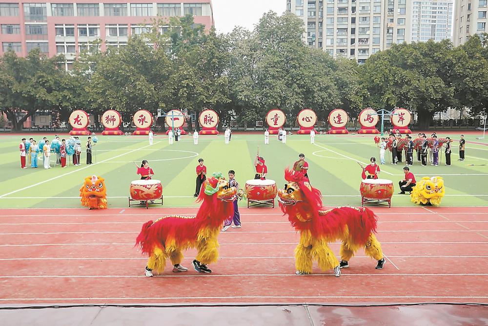 两岸师生进行舞狮表演。