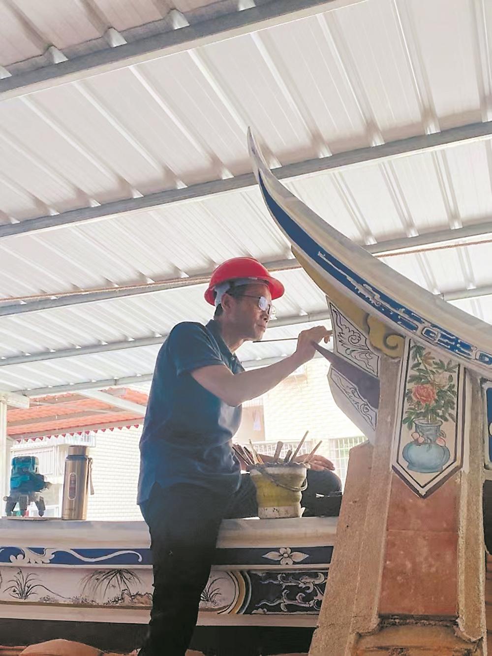 修缮中,严重外凸的右侧墙体如何归安是个难题。施工人员把条石逐一编号,拆卸下后先灌浆加固再重新归安,工序繁多。屋脊上剪瓷修复时新旧并用,只修复残损部位,完好部位则基本保留下来。