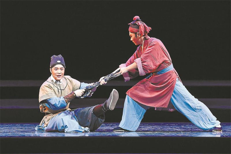 闽剧《过崖记》是我省闽剧舞台上的一出新作。该剧通过一系列戏剧性反转,揭示了人性在善恶边缘自我救赎的觉醒,彰显人心向善的本质,引发观众的思考及警省,具有强烈的现实意义。该剧在本次开幕式上演出的选段,剧情跌宕起伏,心理刻画百转千回,人性剖析鞭辟入里,展现了演员文戏武唱、文武兼备的不俗技艺。一曲唱罢,一声“好”从观众席里爆发出来,随即掌声如潮。