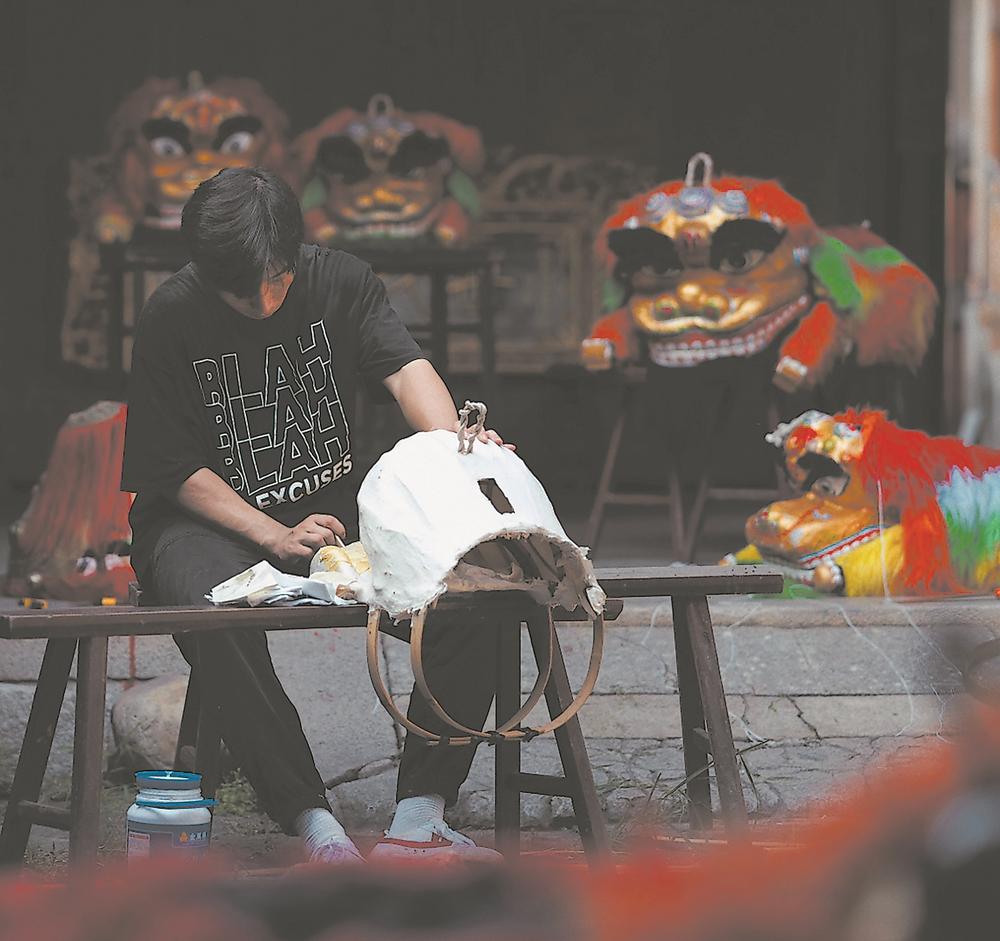 线狮技艺人在制作线狮头部。