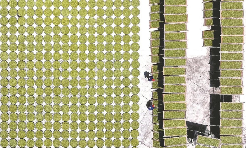近日,茶企工作人员在福鼎市前岐镇鼎白茶业基地晾晒白茶。王旺旺 摄