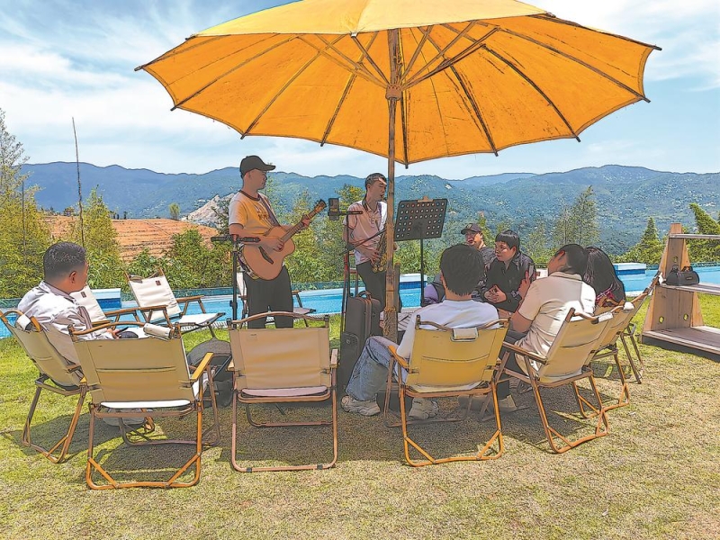 山野之上,响起了歌声。众人手持各式拍摄工具循声而至,镜头聚焦处,是难得一见的画面:远方,群山苍翠,绵延不绝;近处,露天泳池静卧山中,湛蓝清水边,周华贵抱着吉他忘情弹唱。5月13日,闽清县上莲乡的这场即兴表演,融合田园风光与艺术风情,令到访者颇为惊喜。