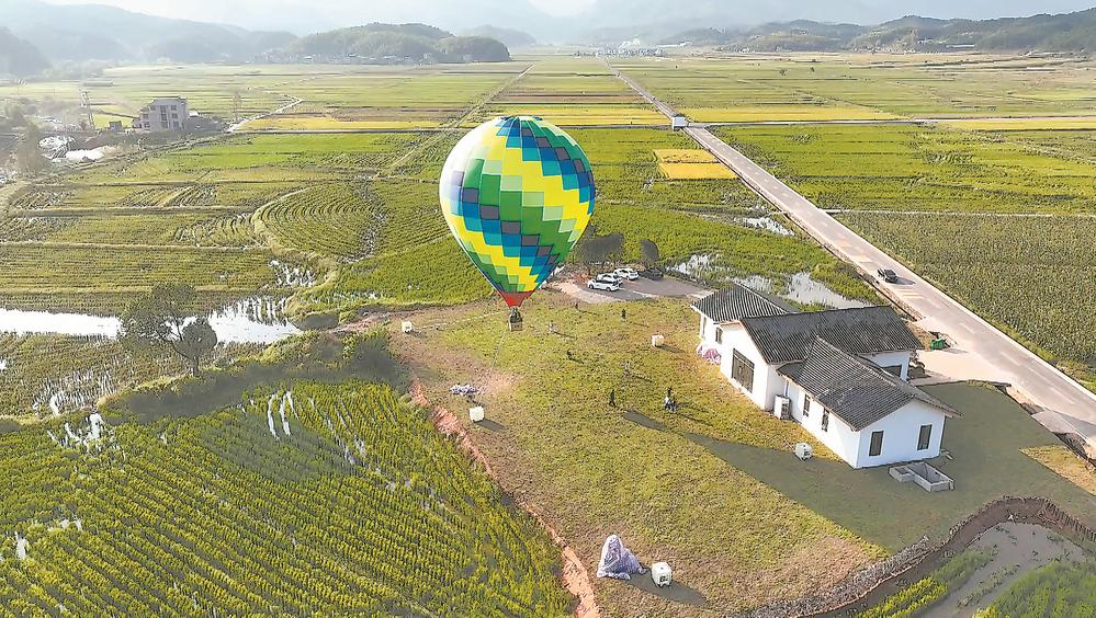 游客可登上热气球,俯瞰阳泉自然村稻田美景。余恒毅 摄