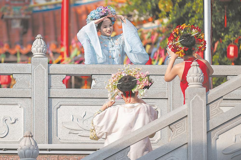 游客在泉州东海街道蟳埔村戴簪花围拍照。记者 王毅 摄