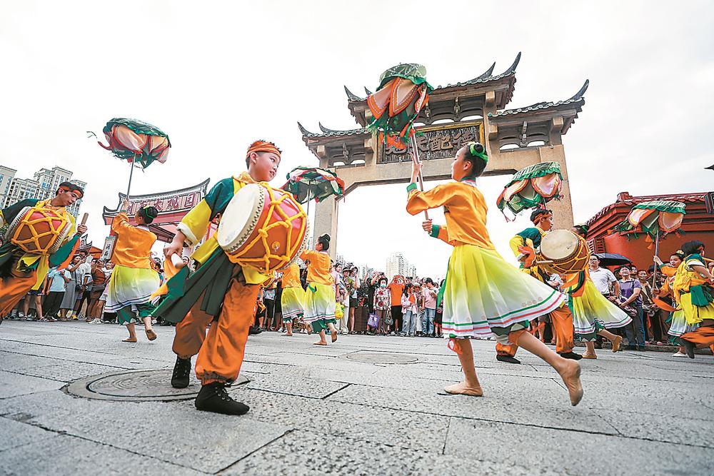 国庆期间,大鼓凉伞在漳州古城表演。郑文典 摄