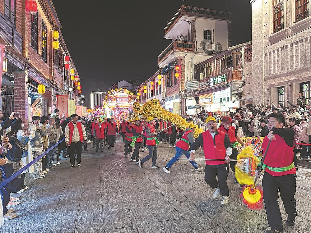 “戏游闽南”古城沉浸式展演也设置了古城巡游活动,方便市民随时随地欣赏传统戏剧。11月28日晚,整座古城俨然一个开放式的非遗和戏剧舞台。芳华横路上传来台湾歌仔戏的婉转唱腔,泮池长廊边飘出新加坡歌仔戏的南洋韵味,市民可以在古街偶遇优质戏剧表演,活动吸引了许多年轻人前来“打卡”。