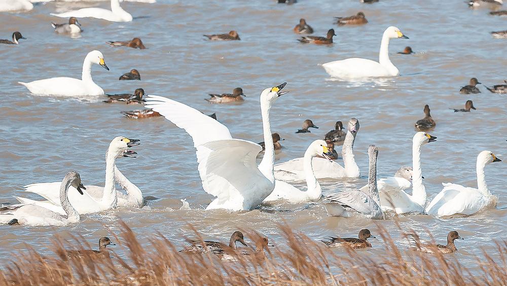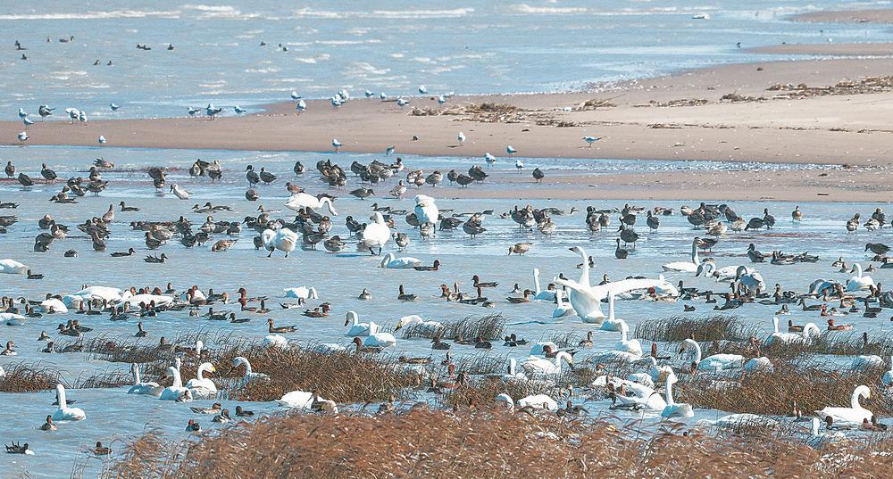 大雪时节已过,近日,闽江河口国家湿地公园上演壮丽的“鸟浪”景观,成群的小天鹅正优雅振翅,与多种候鸟在海潮中共舞,为冬日的湿地增添无限生机(如图)。