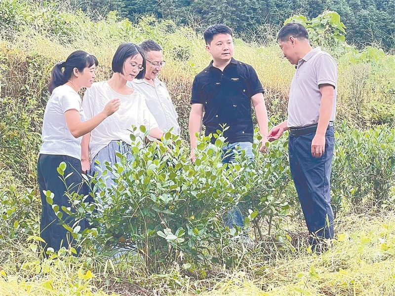 王文震(右二)在茶园观察茶叶生长情况。