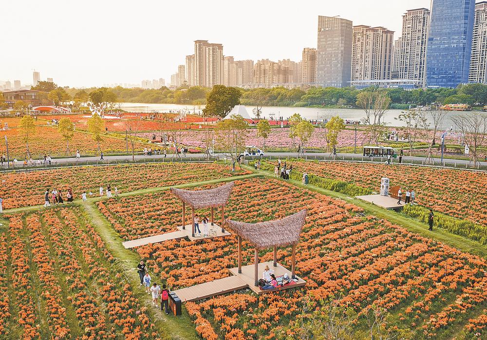 4月11日,龙江岁月的“二十四节气农耕文明体验区”,金鱼草花海与对岸的城市景观交相辉映。记者 施辰静 摄