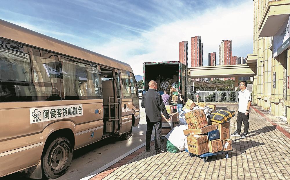 在闽侯客运中心寄递物流共配中心,快递装上公交车,将运送至乡级站点。