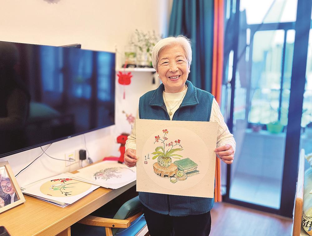 今年88岁的赵育美在福州城投·光大百龄帮颐养中心享受活力满满的养老生活。图为她在房间展示自己的画作。