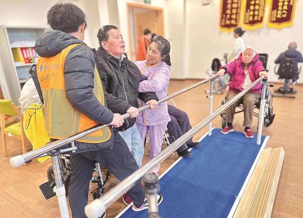 在福州城投·光大百龄帮颐养中心,专业康复师和护理员陪伴老人进行康复和锻炼。